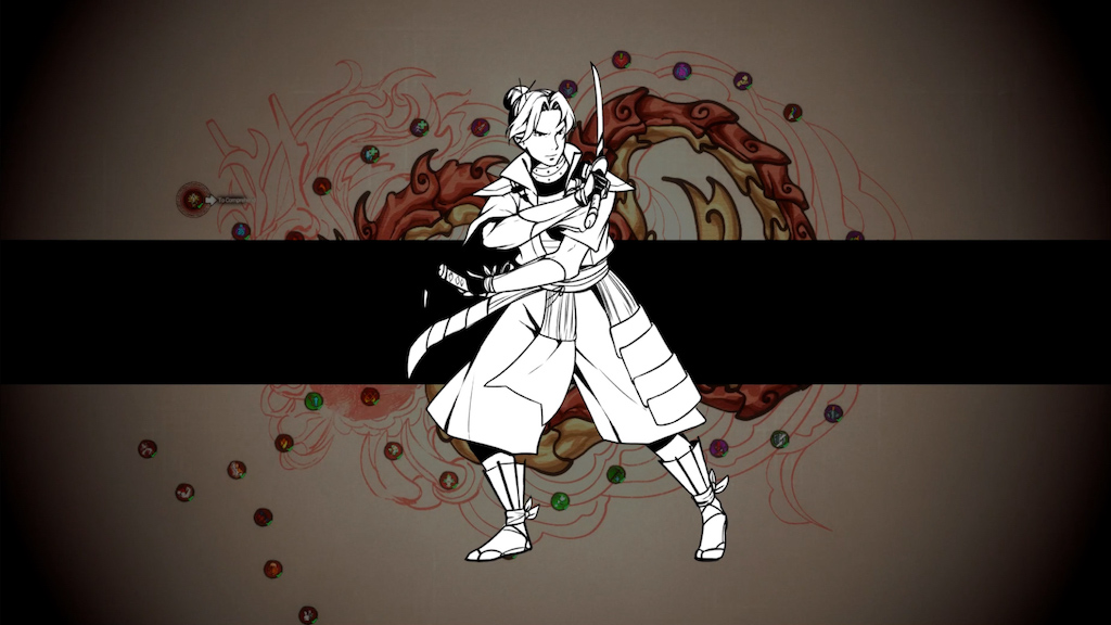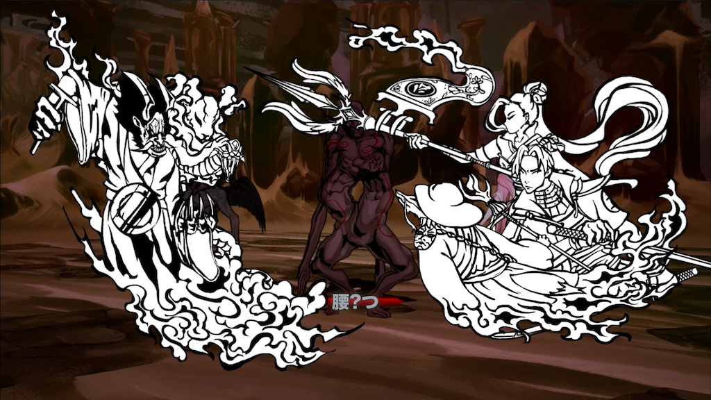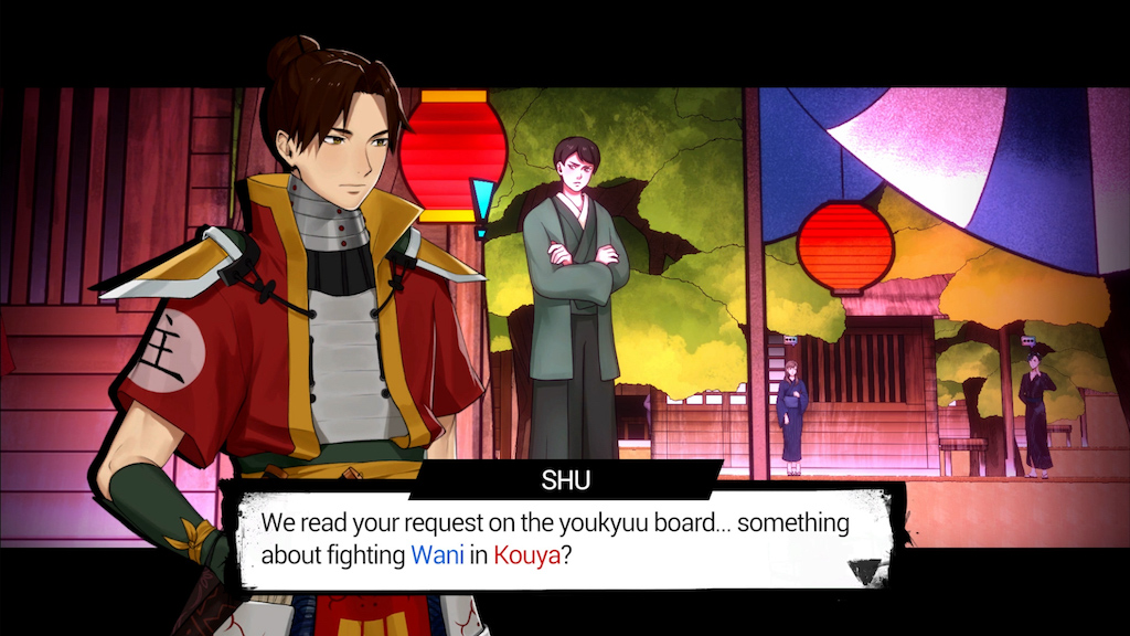 A retired samurai (主) is entrusted with saving the world from intelligent, language-devouring "Akuma" alongside an eccentric fox (人) freed from a cursed abode and an astute princess (公) with her own ambitions.